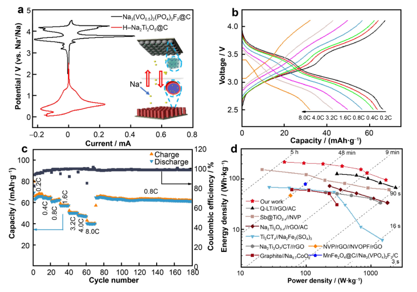 5@C半電池的CV曲線(xiàn)及SIB示意圖(插圖);(b)不同電流密度下的充放電曲線(xiàn);(c)倍率性能和循環(huán)性能;(d)重力能量密度與功率密度的Ragone圖。