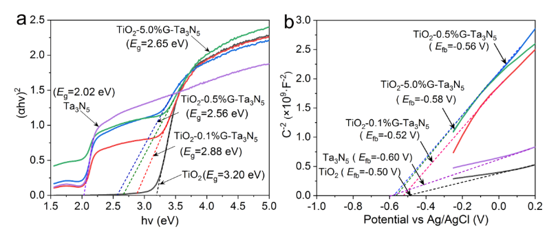 5異質(zhì)結(jié)的(a)Tauc圖和(b) Mott-Schottky圖測(cè)量能帶結(jié)構(gòu)特征。