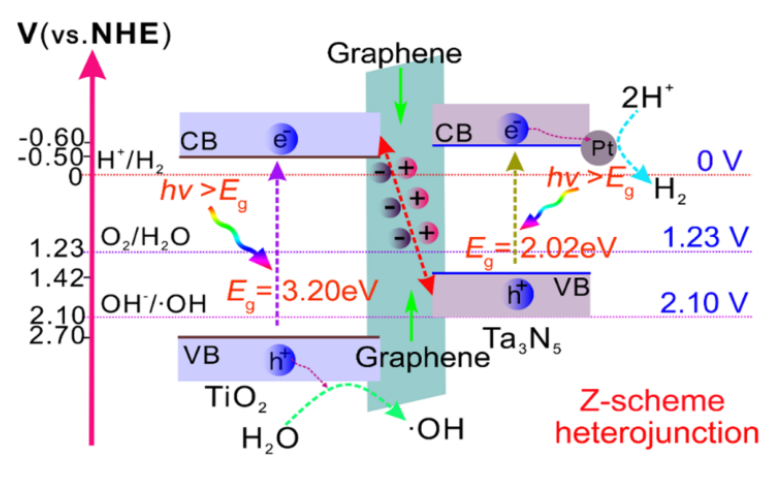 -1。結(jié)合系統(tǒng)表征,我們證明了增強(qiáng)的光催化性能歸因于可見光利用率和電荷轉(zhuǎn)移行為的改善。我們發(fā)現(xiàn)水裂解是通過(guò)Z-型機(jī)制實(shí)現(xiàn)的,其中二維層狀石墨烯作為橋梁,加速了電子從TiO