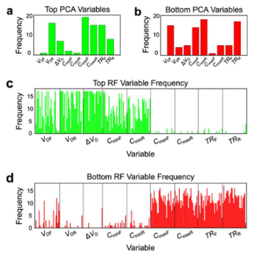 圖3.(a,b)33%的頂部(a)或底部(b)參數(shù)來自PCA預測值排名中的每個特征的頻率。前兩個主要成分的加權(quán)和用于對預測因子進行排序。影響特征包括V