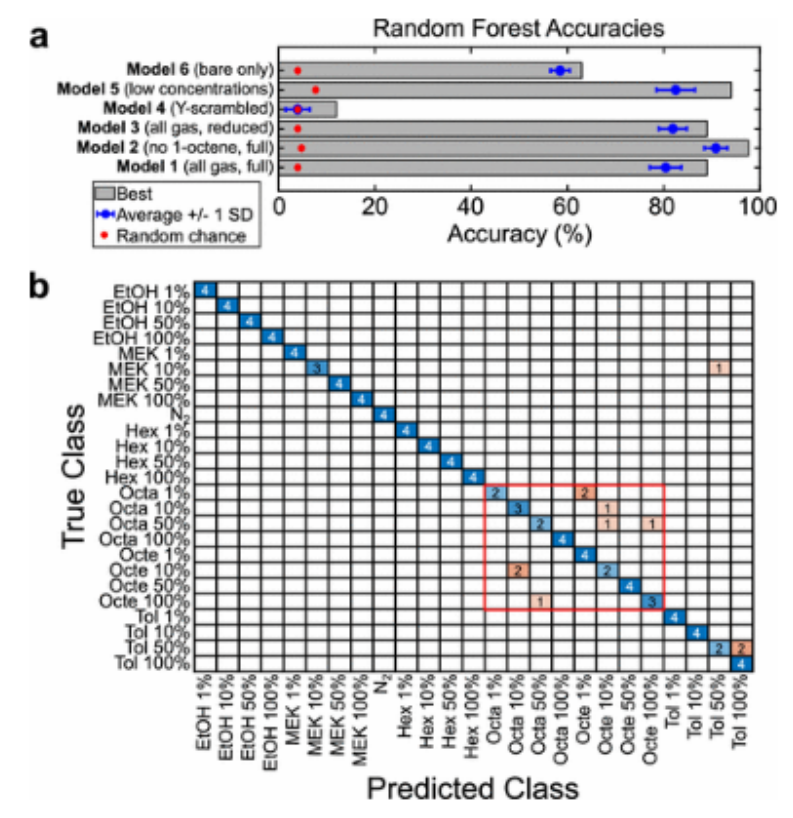 揮發(fā)性有機化合物(VOCs)的快速檢測在許多行業(yè)越來越重要。非侵入性醫(yī)學診斷可能基于人類呼吸中揮發(fā)性有機化合物的特定組合;檢測真菌生長等環(huán)境危害排放的VOCs可以預防疾??;并且可以通過監(jiān)測食物儲存過程中產(chǎn)生的氣體來減少浪費。電子鼻已經(jīng)應用于這些問題,然而,一個常見的限制是提高選擇性。石墨烯是一種適應性強的材料,可以用許多化學受體進行功能化。在這里,我們使用這種多功能性來演示使用基于石墨烯的可變電容器(變?nèi)荻O管)陣列在不同濃度下選擇性和快速檢測多種VOCs。每個陣列包含108個傳感器,這些傳感器用36個化學受體功能化以實現(xiàn)交叉選擇性。來自108個傳感器的多路復用器數(shù)據(jù)采集在幾十秒內(nèi)完成。雖然這種快速測量降低了信號幅度,但使用監(jiān)督機器學習進行分類顯示,在5種分析物(乙醇、己醛、甲基乙基酮、甲苯和辛烷)之間,在4種濃度下,準確率為98%。加入1-辛烯(一種結(jié)構(gòu)與辛烷高度相似的分析物)后,準確度達到89%。這些結(jié)果證明了分析方法選擇的重要作用,特別是在存在噪聲數(shù)據(jù)的情況下。這是充分利用石墨烯傳感器陣列進行快速氣體傳感應用的重要一步,從環(huán)境監(jiān)測到人類呼吸中的疾病檢測。
