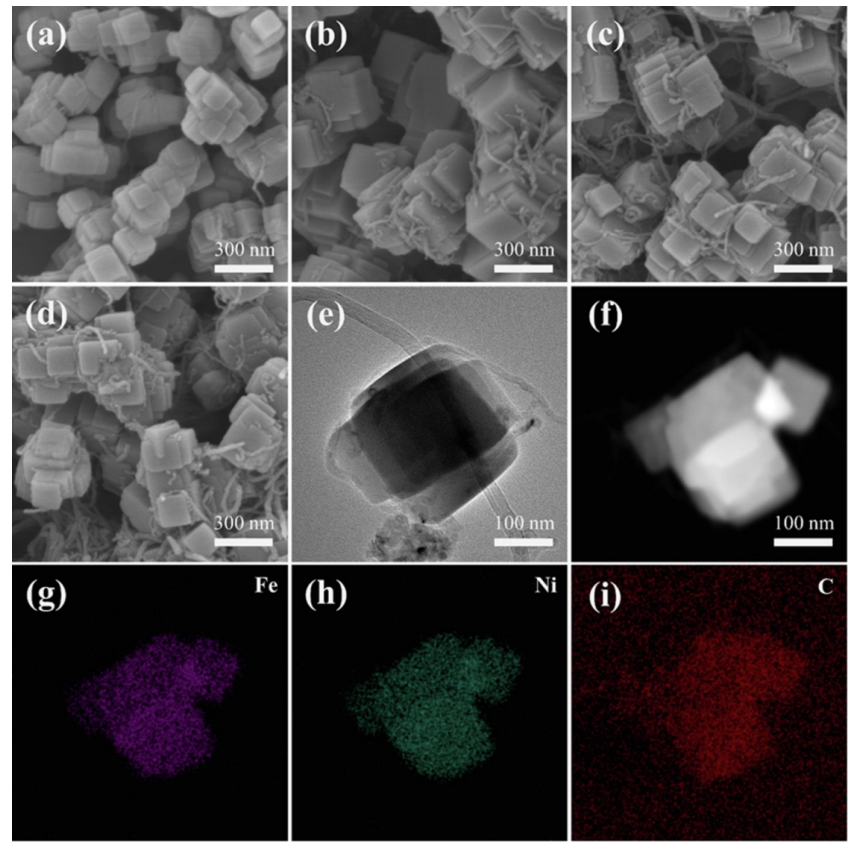 Figure 2. a)NiHCF/CNT-2、(b)NiHCF/CNT-5、(c)NiHCF/CNT-10、(d)NiHCF/CNT-20的FESEM圖像。(e,f)NiHCF/CNT-5的TEM圖像以及(g)Fe、(h)Ni和(i)C的元素映射圖。