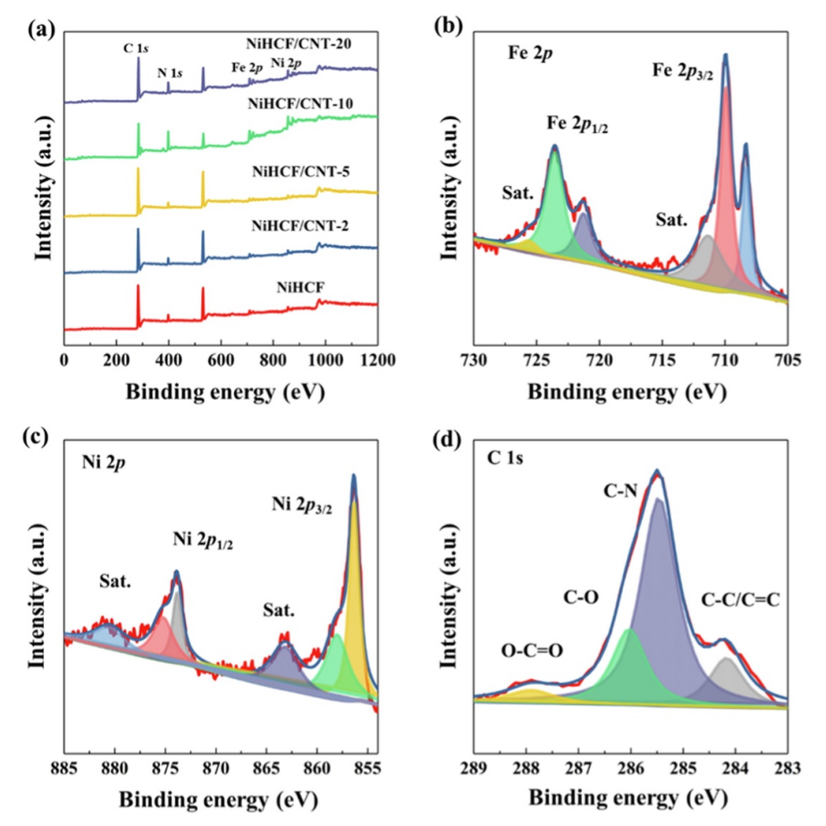 Figure 3. NiHCF/CNT復(fù)合材料的(a)XPS光譜和NiHCF/NNT-5的高分辨率(b)Fe2p、(c)Ni2p和(d)C1s光譜。