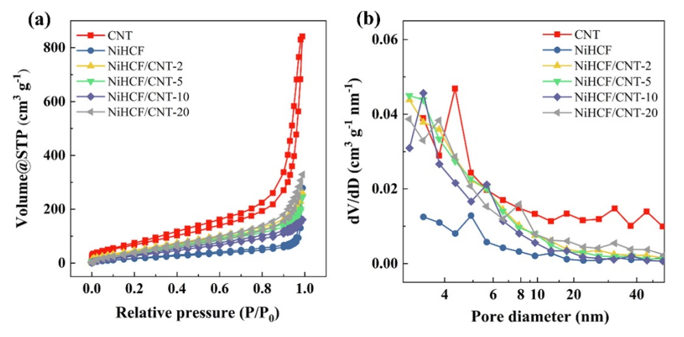 Figure 4. CNT和NiHCF/CNT復(fù)合材料的(a)氮吸附-解吸等溫線和(b)孔徑分布曲線。