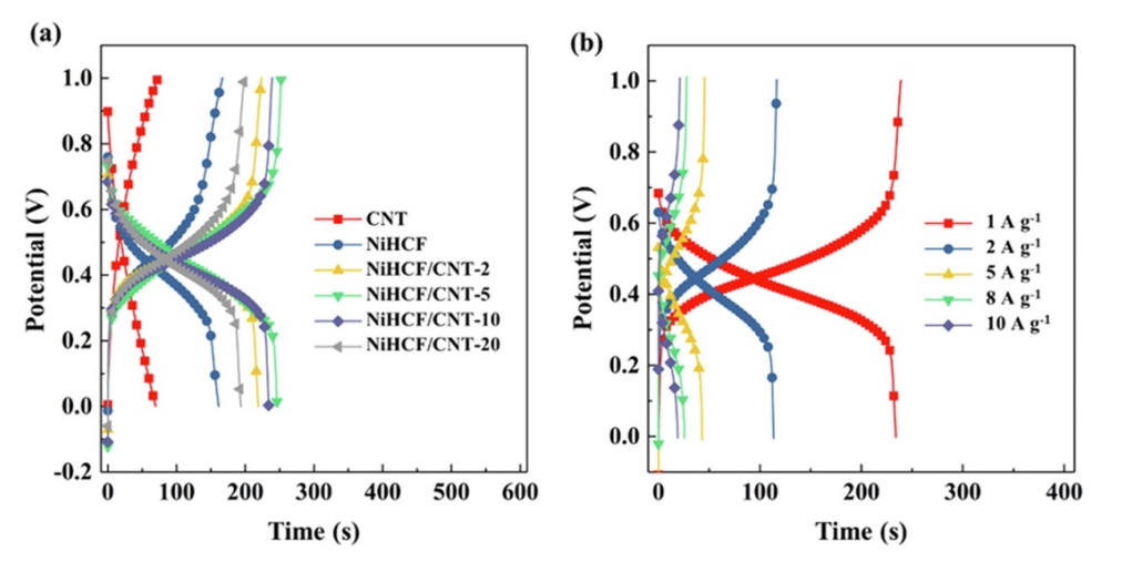 Figure 6. (a)CNT和NiHCF/CNT復(fù)合材料在1 A/g下的GCD曲線;(b)不同電流密度下NiHCF/CNT-5的GCD曲線。