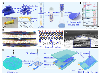 MXene因其優(yōu)異的力學(xué)性能、金屬導(dǎo)電性等物理化學(xué)性能而受到廣泛關(guān)注。然而,其優(yōu)異的機(jī)械性能通常表現(xiàn)在納米級單層MXene片材中。由于MXene在成型過程中各層之間的范德華相互作用較差,MXene薄膜在宏觀尺度上往往表現(xiàn)出較差的力學(xué)性能,如脆性,甚至斷裂。因此,當(dāng)具有優(yōu)異電子性能的MXenes用于器件時(shí),其抵抗外界損傷的能力往往較差,使得器件性能容易退化甚至失效。這里使用一維芳綸納米纖維通過層間氫鍵作用構(gòu)建了具有高機(jī)械強(qiáng)度的MXene納米片。MXene膜片用于自修復(fù)柔性壓力傳感器,具有高靈敏度(208.7 kPa