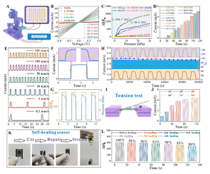 -1 的超高靈敏度。 (D) 在低于 30 kPa 的連續(xù)壓力下,具有 30% ANF 的傳感器的 I - T 曲線。 (E) 傳感器在 12.52 kPa 下的不同速度下表現(xiàn)出優(yōu)異的傳感性能均勻性。 (F) 傳感器在 1.81 kPa 下的響應(yīng)和恢復(fù)時(shí)間。 (G) I - T 和 P - T 曲線在 10.51 kPa 下的周期性加載和卸載條件下的響應(yīng)。 (H) 器件在 21.56 kPa 壓力下經(jīng)過 45,000 次壓力循環(huán)后具有優(yōu)異的循環(huán)穩(wěn)定性能。右軸表示保留百分比。 (I) 張力測試系統(tǒng)示意圖。 (J) 在 10° 到 60° 的連續(xù)彎曲角度下,使用 30% ANF 的傳感器的 I − T 曲線。 (K) 顯示設(shè)備自我修復(fù)過程的照片。 (L) 設(shè)備在 1.84 kPa 下經(jīng)過多次自愈過程循環(huán)后的靈敏度。