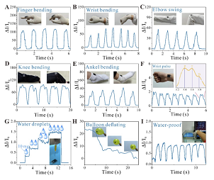 Figure 5. .高強(qiáng)度MXene壓力傳感器在實(shí)時(shí)監(jiān)測人體活動(dòng)和檢測微小物理信號方面的應(yīng)用(第一組)。電流變化形式的信號響應(yīng)來自(A)手指彎曲,(B)手腕彎曲,(C)肘部擺動(dòng),(D)膝蓋彎曲,(E)腳踝彎曲,(F)手腕脈搏(放大圖是脈沖振動(dòng)波形的放大圖),(G)水滴(9.8Pa),(H)氣球放氣,(I)防水性能。