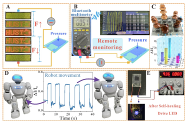 Figure 6. 高強(qiáng)度 MXene 壓力傳感器的應(yīng)用(第 II 組)。 (A) 壓力信號通過傳感器控制 LED 的亮度。 (B) 電路中壓力信號的遠(yuǎn)程監(jiān)控。 (C) 壓力陣列識別。 (D) 檢測機(jī)器人的運(yùn)動(dòng)。 (E) 傳感器經(jīng)過自愈處理后仍然可以控制LED的亮度。