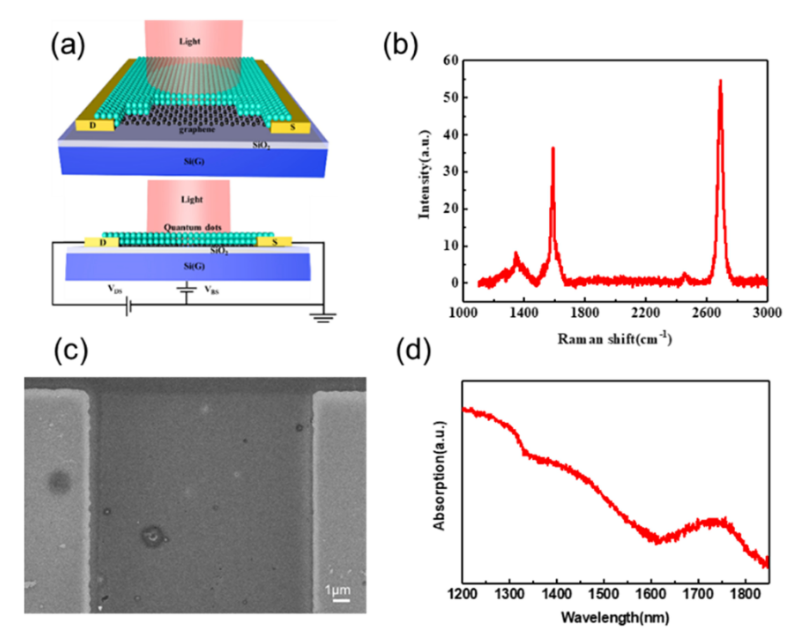 圖1. 量子點(diǎn)改性石墨烯器件結(jié)構(gòu)示意圖及相關(guān)材料表征。(a)量子點(diǎn)改性石墨烯探測器,D、S電極與石墨烯直接形成歐姆接觸,背柵電極為n型重?fù)诫s硅。(b)設(shè)備的掃描電子顯微鏡(SEM)圖像。(c)石墨烯在SiO