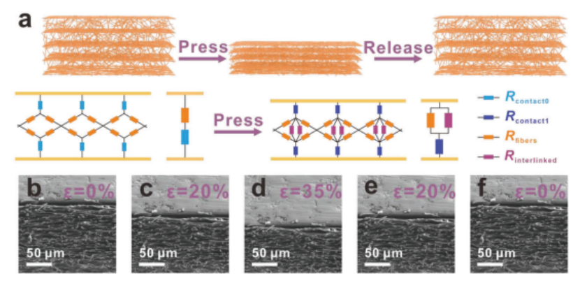 −1)的寬溫度范圍內(nèi)表現(xiàn)出超高的靈敏度,9 Pa的低檢測(cè)限,163 ms的快速響應(yīng)時(shí)間,在室溫下超過10000次循環(huán),在100℃下2000次循環(huán)和在-5℃下500次循環(huán)的優(yōu)異耐久性。壓力傳感器可以實(shí)時(shí)監(jiān)測(cè)人類的各種活動(dòng),適用于人機(jī)交互,測(cè)量壓力分布。它還能在150°C和極低溫度(液氮)下對(duì)外界機(jī)械刺激作出敏感反應(yīng)。此外,纖維網(wǎng)絡(luò)表現(xiàn)出優(yōu)異的焦耳加熱性能,在施加電壓為12 V時(shí)可達(dá)到78℃。因此,壓阻傳感器在可穿戴服裝和惡劣溫度條件下的個(gè)人加熱應(yīng)用方面具有相當(dāng)大的潛力。