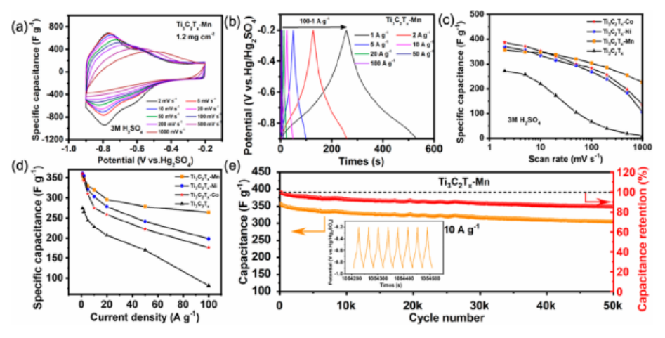 MXenes通常用于能量存儲(chǔ)應(yīng)用。然而,大的納米片和重新填充不利于離子擴(kuò)散,從而限制了其速率能力。在這里,一種制備柔性多孔MXene−M超級電容器電極的策略可以同時(shí)擴(kuò)大層間的層間距并在層中形成孔。結(jié)果表明,Ti