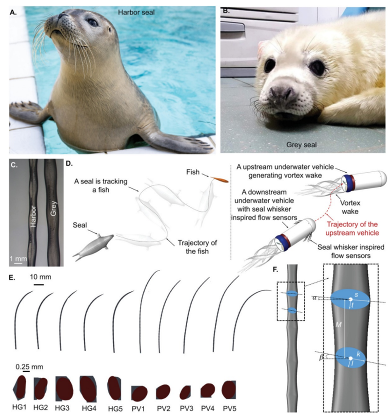 Fig1. 海豹和起伏的海豹須。A) 斑海豹 ( Phoca vitulina )、B) 灰海豹 ( Halichoerus grypus ) 和 C) 它們的胡須特寫圖像顯示了獨(dú)特的起伏形態(tài)。D) 顯示海豹須追蹤魚的能力和海豹須啟發(fā)的水下航行器流量傳感器尾流檢測功能的示意圖。E) 五只灰海豹 ( Halichoerus grypus , HG) 胡須 1–5 和五只斑海豹 ( Phoca vitulina, PV) 胡須 1-5 使用藍(lán)光掃描技術(shù)掃描。每個掃描的海豹胡須都以全長顯示,并捕獲了胡須基部。海豹的所有胡須都以相同的比例顯示。F) 由 Hank 等人提出的幾何模型構(gòu)建的胡須結(jié)構(gòu)。