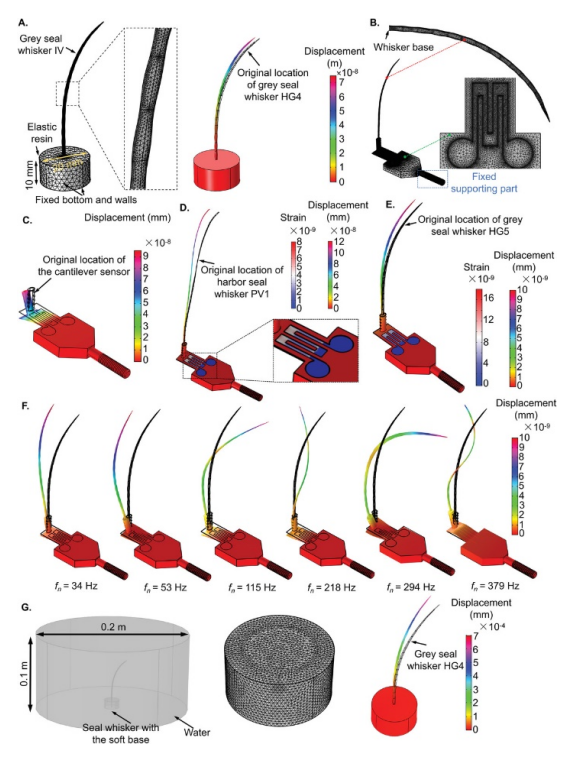 Fig 4. 基于 COMSOL Multiphysics 的印刷懸臂梁傳感器和胡須的自然頻率模擬。 A) 帶有和不帶軟底的隔離灰色胡須 IV 的生成網(wǎng)格和第一模態(tài)形狀(變形因子:50 000)。 B) 帶有胡須的懸臂傳感器生成的網(wǎng)格。 C) 印刷傳感器(固有頻率≈132 Hz)的第一振型(變形因子:50 000)。帶有 D) 斑海豹須 I(PV1,自然頻率 ≈ 34 Hz)和 E)灰海豹須 V(HG5,自然頻率 ≈ 34 Hz)的懸臂傳感器的第一模態(tài)形狀(變形因子:50 000)。 F) Gray seal whisker V (HG5) 的各種振型(變形因子:200 000)。 G) 模擬的計算域,其中具有軟基的胡須位于圓柱形水域和灰色胡須 IV 的第一模態(tài)形狀(變形因子:10)。