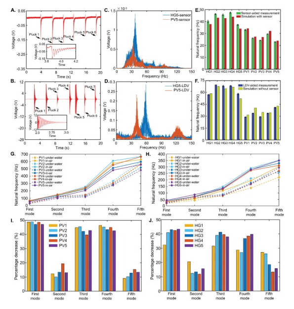 Fig 5. 測量和模擬的固有頻率。 A) 懸臂傳感器和 B) 拔除海豹須時的 LDV 數(shù)據(jù)的時間序列。C) 懸臂傳感器和 D) LDV 數(shù)據(jù)的時間序列的 FFT 分析。 E) 懸臂傳感器和 F) 基于 LDV 的測量中模擬和測量的自然頻率之間的比較。 G) 斑海豹 (PV) 和 H) 灰海豹 (HG) 胡須在水下(虛線)和空氣中(實線)的各種自然頻率模式。 I) 斑海豹(PV) 和 J) 灰海豹 (HG) 胡須的水下自然頻率與空氣中自然頻率相比的百分比下降。