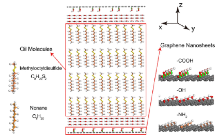 在本研究中,本研究使用非平衡分子動力學(xué)(NEMD)模擬來研究油在表面功能化石墨烯通道中的壓力驅(qū)動流動。本研究發(fā)現(xiàn),通過將水引入通道,可以提高輸油速度。進(jìn)一步的研究揭示了水-油系統(tǒng)傳輸速度增加的兩種可能的不同機(jī)制:一方面,水膜在驅(qū)動力下在油和石墨烯基底之間形成,這阻止了石墨烯層和油分子之間的顯著分子間相互作用;另一方面,液體混合物的表觀粘度通過在通道中引入水而降低,這提高了運輸效率。對具有不同官能團(tuán)的表面和具有不同極性的油的進(jìn)一步比較分析證明了這種水誘導(dǎo)的油的流動傳輸增強(qiáng)的普遍性。該結(jié)果可用于優(yōu)化現(xiàn)有的采油裝置以提高石油運輸效率。
