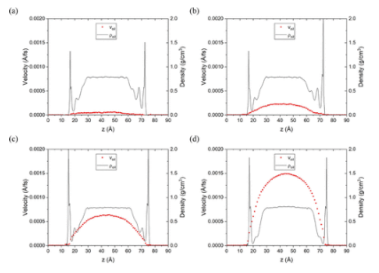 –2 kcal/mol•Å。通過中心速度和所有速度擬合,可以觀察到中心粘度和表觀粘度之間的明顯差異。此外,在大的驅(qū)動力下,-OH官能化通道顯示出優(yōu)異的油傳輸性能,而在相對較低的驅(qū)動力之下,油傳輸速度仍然與通道壁的親水性一致。