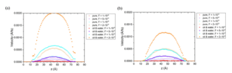 圖11.(a) -COOH功能化石墨烯通道中純油和水-油系統(tǒng)的速度分布。這里的油是非極性壬烷。(b) F=2×10