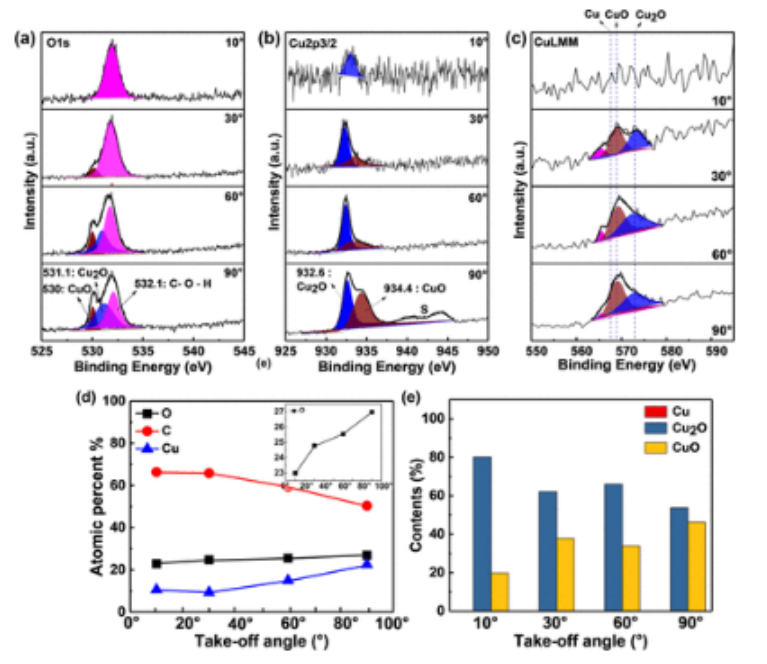 圖3. 根據(jù)ARXPS得出的界面氧化物層中C、O和Cu(a–d)元素的原子百分比以及Cu、Cu