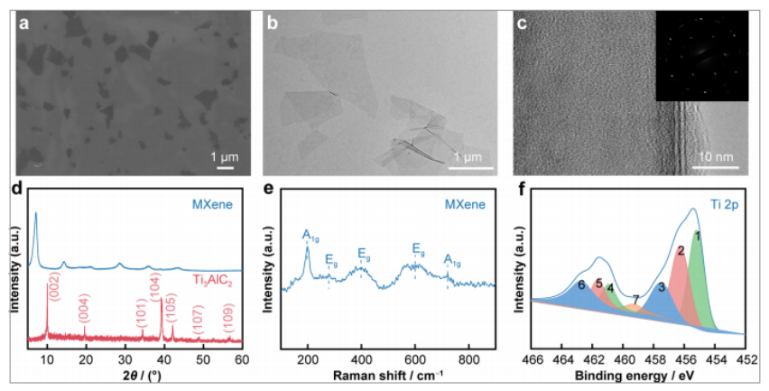 圖2. a和b單層MXene納米片的SEM和TEM圖像;c多層MXene納米片的HRTEM圖像和嵌入為SAED圖案;d Ti