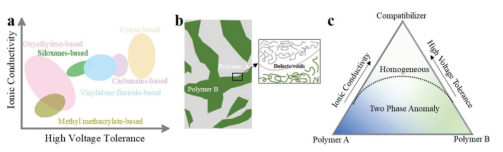 圖1. a)各種SPEs的離子電導(dǎo)率及其高電壓耐受性比較。B)在相界面處具有缺陷或空隙的聚合物共混物的相分離。C)高性能相容劑通過增強(qiáng)分子內(nèi)相互作用來提高聚合物共混物的離子電導(dǎo)率和耐高壓性。