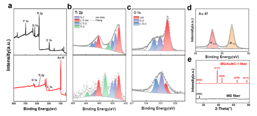 -1纖維的XPS光譜比較:(a)寬調(diào)查光譜;(b) Ti 2p,(c) O 1s和(d) Au 4f區(qū)域的核心能級(jí)光譜。(e) MG和MG/AuNCs
