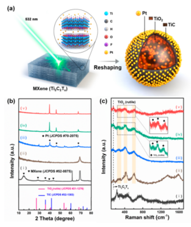 2@ TiC/Pt的原理圖設(shè)計。(b, c) XRD和拉曼光譜,分別為(i) MXene, (ii) TiO