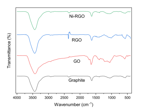 圖1. 石墨, GO, RGO 和 Ni-RGO的FT-IR譜。