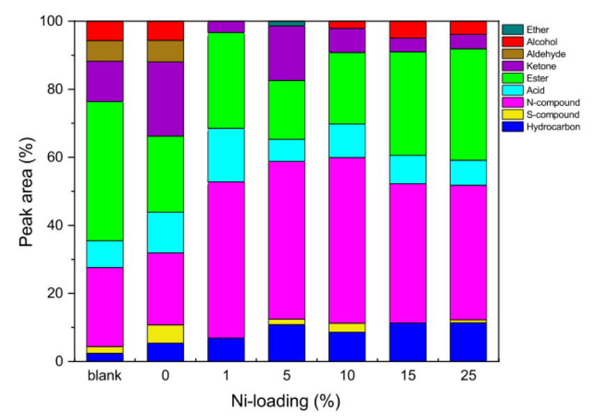 圖6. 不同催化劑對(duì)生物油的GC-MS分析。