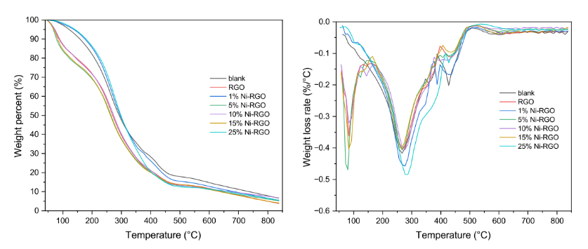 圖7. 生物油在不同催化劑時(shí)的TG/DTG曲線(xiàn)。