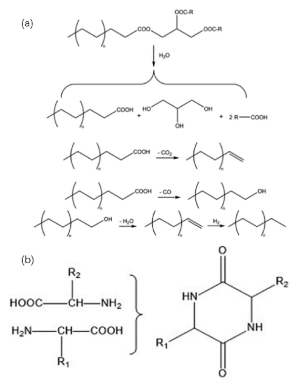 圖9. (a)脂質(zhì)生成烴、(b)由氨基酸生成的2,5-二酮哌嗪的機(jī)理。