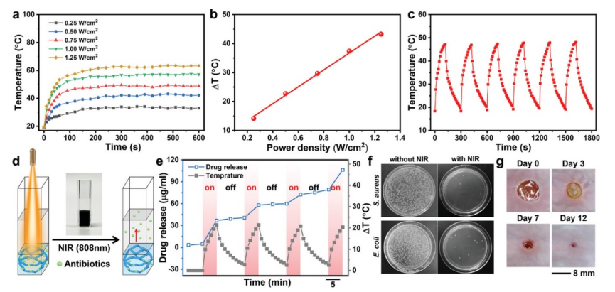 Fig 7. a)在不同功率密度的 NIR 光(808 nm)照射下,基于柔性 MXene 水凝膠的表皮傳感器的時(shí)間依賴性溫度曲線。b) ΔT(ΔT表示從實(shí)驗(yàn)室溫(≈20℃)到平衡溫度的溫度變化)與NIR光功率密度之間關(guān)系的擬合曲線。c) MXene 水凝膠基表皮傳感器在可逆 NIR 光切換下的循環(huán)加熱性能(0.75 W cm -2). d) MXene水凝膠在長(zhǎng)期近紅外光照射下藥物釋放的示意圖。插圖顯示了在裝有 pH 7.2 PBS 溶液的塑料比色皿中載有抗生素 (CE) 的 MXene 水凝膠的光學(xué)照片。e) 光控溫度升高和藥物 (CE) 從 MXene 水凝膠中釋放曲線,以響應(yīng)循環(huán)溫度交替以及循環(huán) NIR 光照射。f) MXene 水凝膠 + 抗生素 (CE) 組活菌落的代表性圖像,沒有和有 NIR 照射(0.75 W cm -2,10 分鐘)。g) 用 MXene 水凝膠 + 抗生素 (CE) + NIR 處理的傷口的代表性照片。