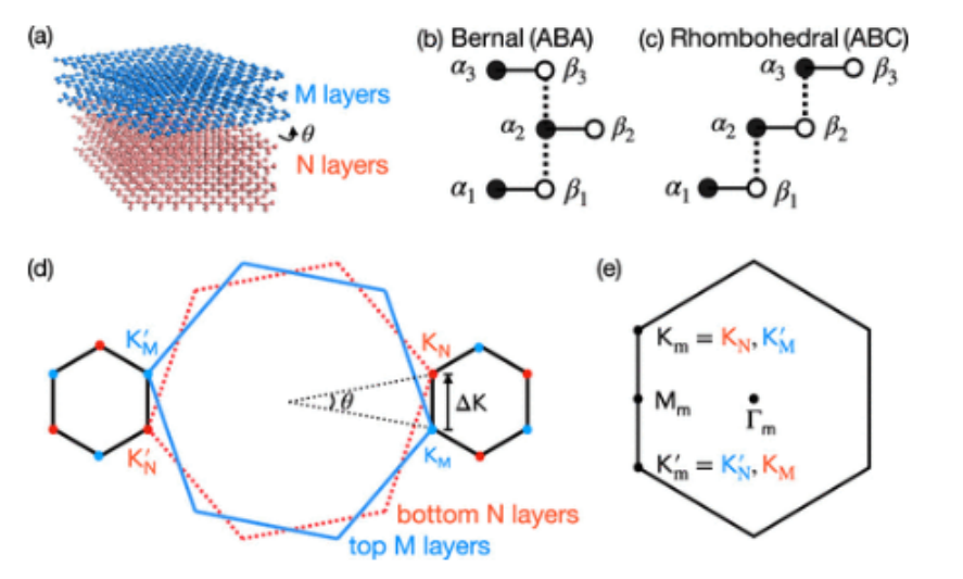 圖1:(a)扭曲的N+M多層石墨烯的示意圖,以及(b)貝納爾和(c)斜方體堆積構(gòu)型。(d) 頂部(藍(lán)色)和底部(紅色)的有序多層石墨烯對(duì)應(yīng)的布里淵區(qū)。黑色的六邊形代表在谷底K和K′的莫伊里互格。(e) 莫伊雷布里淵區(qū)與相關(guān)的高對(duì)稱點(diǎn)繪制。