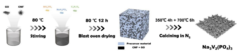 3 (NVP)的本征電導(dǎo)率限制了其進(jìn)一步應(yīng)用。本文提出了一種以還原氧化石墨烯(rGO)和納米纖維素為額外碳源的原位合成多孔NVP的協(xié)同策略。具體而言,氧化石墨烯的碳化形成了高度石墨化的還原氧化石墨烯襯底,有效地阻礙了NVP顆粒的團(tuán)聚。同時,納米纖維素炭化生成無序薄碳涂層,與還原氧化石墨烯襯底構(gòu)建相互連接的導(dǎo)電網(wǎng)絡(luò)。雙碳涂層網(wǎng)絡(luò)顯著提高了電子導(dǎo)電性,增強了動力學(xué)特性。此外,活性NVP晶粒在還原氧化石墨烯上外延均勻生長,形成多孔結(jié)構(gòu),有利于活性物質(zhì)的進(jìn)一步利用。樣品中的介孔可以作為Na