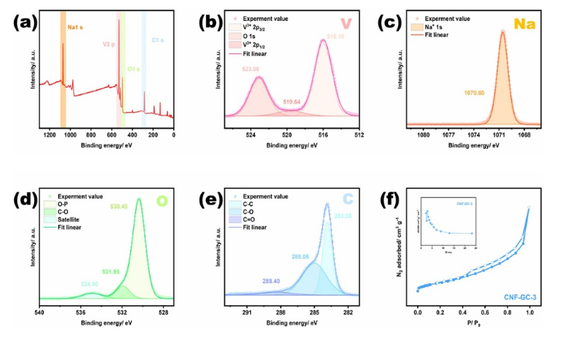 圖5. CNF-GC-3的(a)XPS測量光譜及相應(yīng)的V 2 p (b)、Na 1 s (c)、O 1 s (d)和C 1 s (e)的高分辨率光譜。(f) CNF-GC-3的N