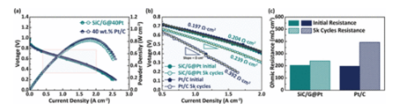 圖3. PEMFCs中SiC/G@Pt和Pt/C催化劑的電化學(xué)性能。(a)I-V極化曲線,(b)用于確定歐姆電阻的I-V曲線a部分的線性部分,以及(c)5000次循環(huán)之前和之后的歐姆電阻。