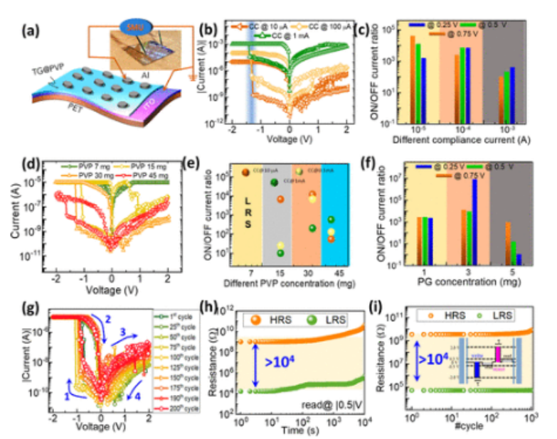 圖1. ReRAM器件的合成和制造過程。(a, b)PTG的合成協(xié)議;(c)使用PTG嵌入PVP作為活性層的器件的制造。