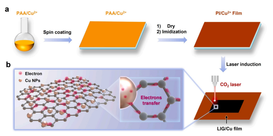圖1. (a)制備LIG/Cu的合成方案。(b) Cu NPs向石墨烯的電子轉(zhuǎn)移示意圖。