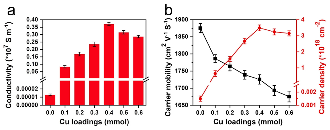 圖2. (a)不同銅負(fù)載樣品的電導(dǎo)率。(b)不同樣品載流子遷移率和密度的霍爾效應(yīng)測(cè)量。