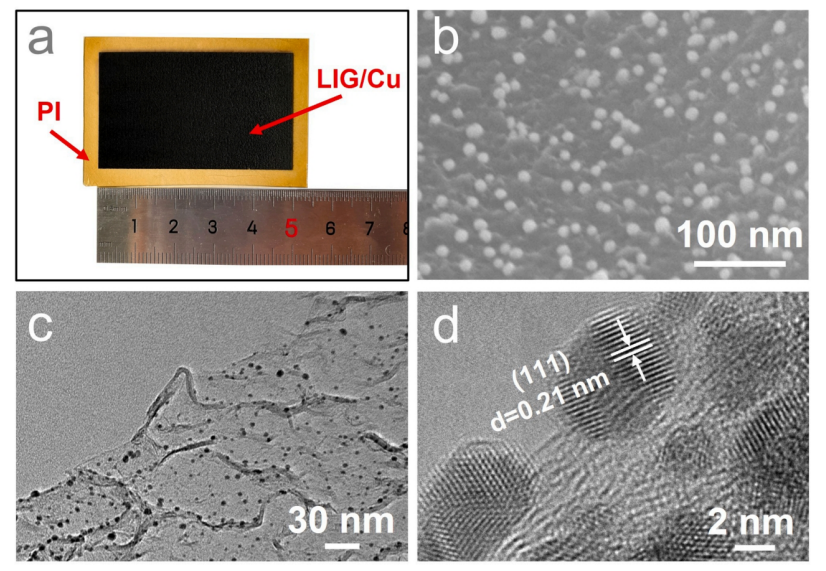 圖3. (a) LIG/Cu的光學(xué)照片。(b) LIG/Cu的SEM俯視圖。(c) LIG/Cu的TEM圖像。(d) LIG/Cu的高分辨率TEM圖像。