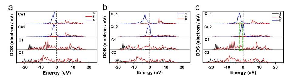 圖7. (a) M1, (b) M2, (e) M3中Cu, C原子的分波態(tài)密度(PDOS)比較。Cu l和Cu 2分別表示次外層和最外層的Cu原子。C1和C2表示第一近鄰和第二近鄰的C原子。