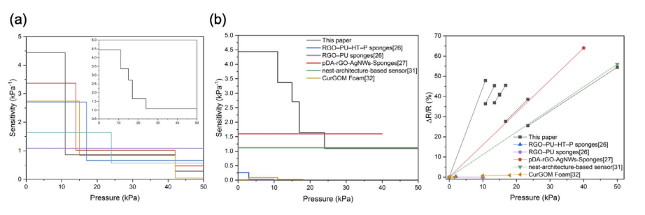 圖1. (a)本工作設(shè)計(jì)的石墨烯柔性壓力傳感器的靈敏度-壓力曲線。(b)本工作與其他報(bào)告中壓力傳感器的比較。