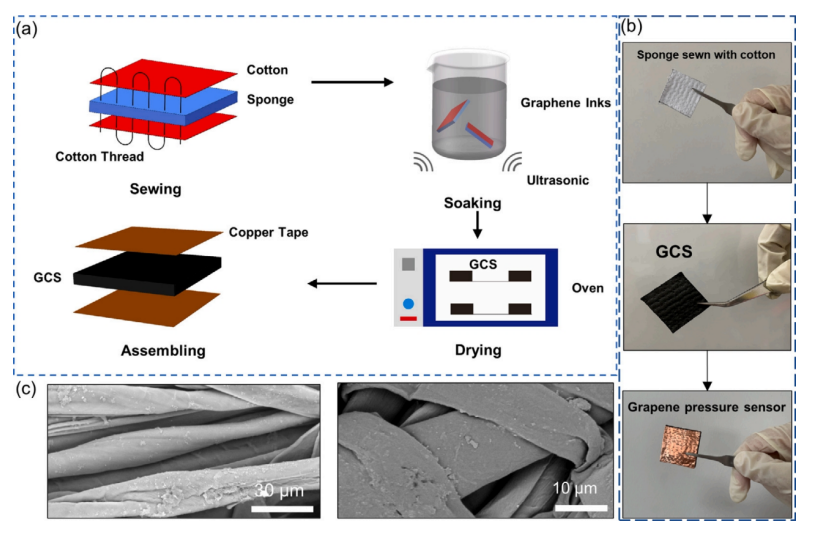 圖3. (a)棉縫海綿柔性石墨烯壓力傳感器制作工藝示意圖。(b)制作過(guò)程照片:用棉花、GCS和石墨烯壓力傳感器縫制的海綿。(c)涂覆石墨烯的棉織物的掃描電鏡(SEM)圖像。
