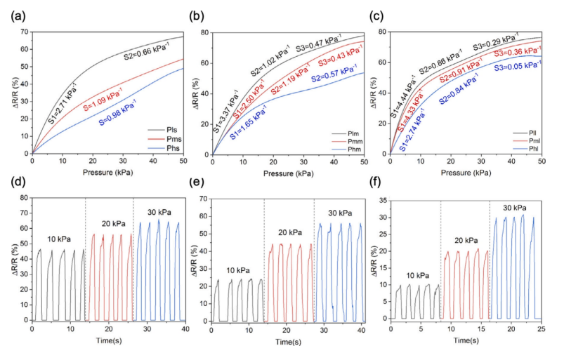 圖7. 不同密度海綿在縫線間距為(a) 6mm, (b) 4mm, (c)2mm處的相對(duì)阻力-壓力曲線。(d) Pll、(e) Pmm、(f) Phs的可靠性測(cè)試。
