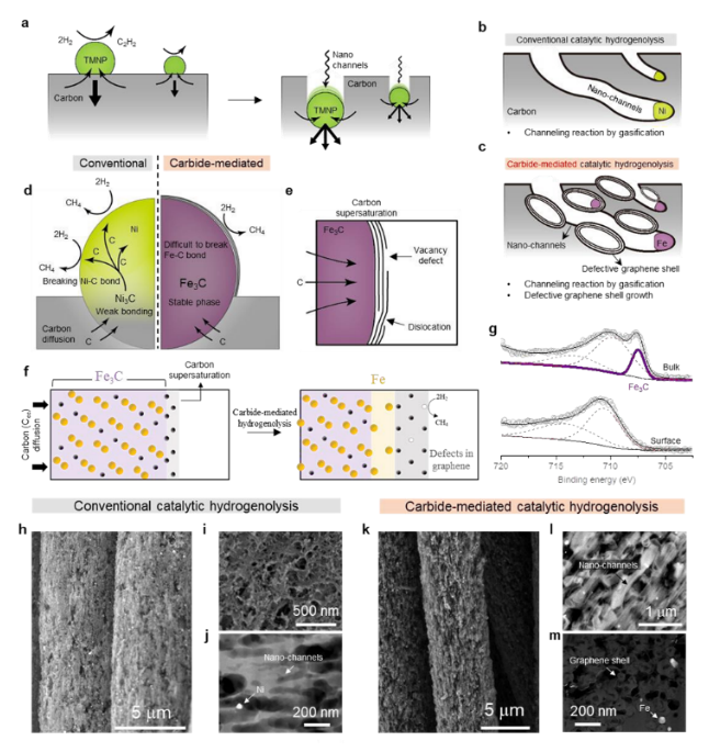 3C/Fe 催化劑上的等溫生長 (e-f) 來自碳化物介導(dǎo)的氫解的碳過飽和。 (g) CM-hy-C 的 XPS 深度剖析分析。 (h-j) Ni 催化劑 (hy-C) 常規(guī)氫解后碳的 SEM 圖像(h 和 i)和橫截面 TEM 圖像(j)。 (k-m) 在碳化物介導(dǎo)的 Fe 催化劑氫解后碳的 SEM 圖像(k 和 l)和橫截面 TEM 圖像(m)。