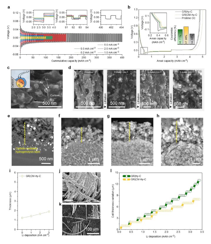 -2 Li 后的橫截面 SEM 圖像電鍍 GR|CM–hy–C (h)。 (i) 碳化物介導(dǎo)的氫解層的厚度作為 Li 沉積量。 (j 和 k) 鍍鋰 GR|CM–hy–C (j) 和 GR|hy–C (k) 在 3.4 mAh cm