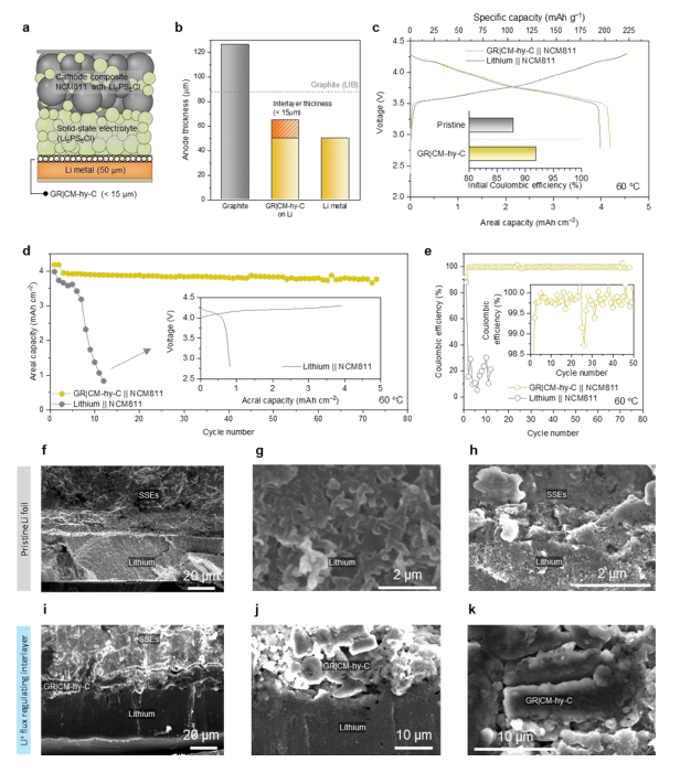 -2 的各種陽極電極的估計(jì)厚度。 (c) GR|CM–hy–C || 的第一個(gè)循環(huán)電壓曲線NCM811和鋰|| NCM811。 (d 和 e) GR|CM–hy–C || 的循環(huán)性能 (d) 和庫侖效率 (e) NCM811和鋰|| NCM811。所有測試均在充電和放電過程中以 0.3 C 倍率的電流密度進(jìn)行。 (f-h) 循環(huán)后鋰的橫截面 SEM 圖像 || NCM811。 (i-k) 循環(huán)后 GR|CM–hy–C || 的橫截面 SEM 圖像NCM811。
