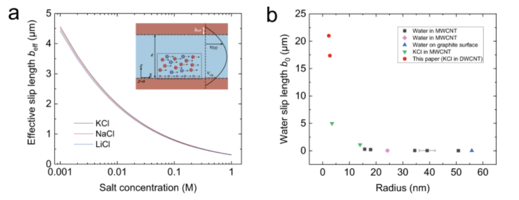 2 ) 用于輸送 KCl、NaCl 和 LiCl 溶液通過管道。進一步的實驗表明,這種非凡的性能源于超高的滑移長度(高達幾微米)。我們的結(jié)果表明,碳納米管不僅是超快傳輸?shù)牧己煤蜻x者,而且是鹽度梯度下滲透能量收集的良好候選者。