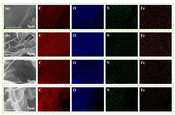 圖3. 20% GO@MAFcNTO (a)、40% GO@MAFcNTO (b)、60% GO@MAFcNTO (c)、80% GO@MAFcNTO (d)復(fù)合材料的EDS圖。