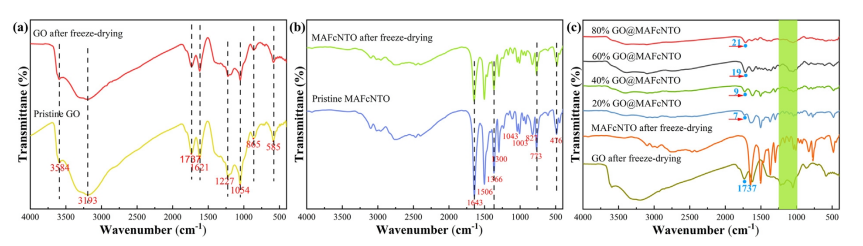 圖4. GO (a)、MAFcNTO (b)和GO@MAFCNTO復(fù)合材料(c)的FT-IR結(jié)果。
